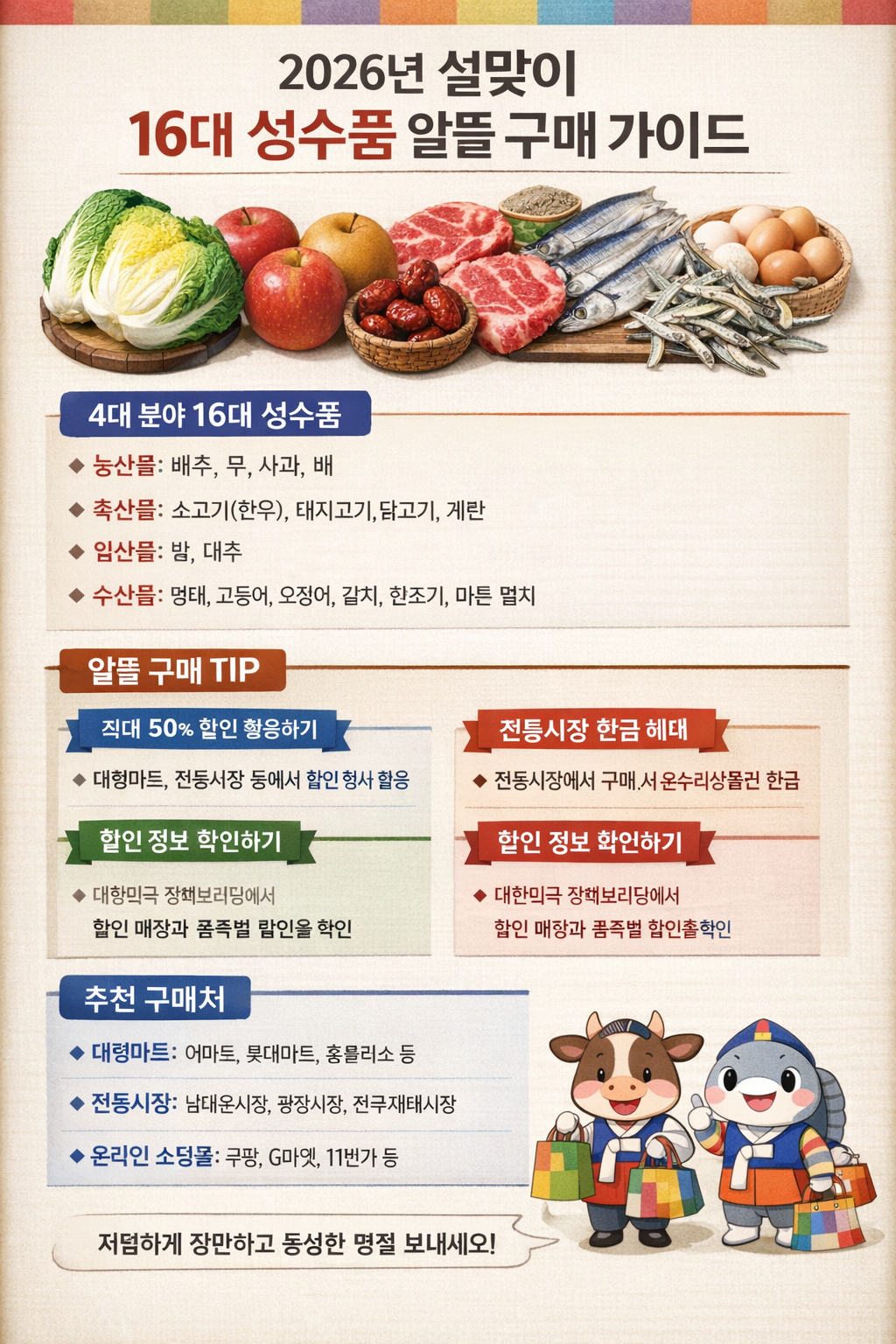 설날이 다가오면 가족을 위한 음식 준비가 빠질 수 없어요. 특히 성수품은 설 밥상에서 빠지면 섭섭하죠! 그런데 매년 오르는 물가에 부담 느껴지지 않으세요? 오늘은 2026년 설 명절을 알뜰하게 준비하는 꿀팁을 소개할게요!
