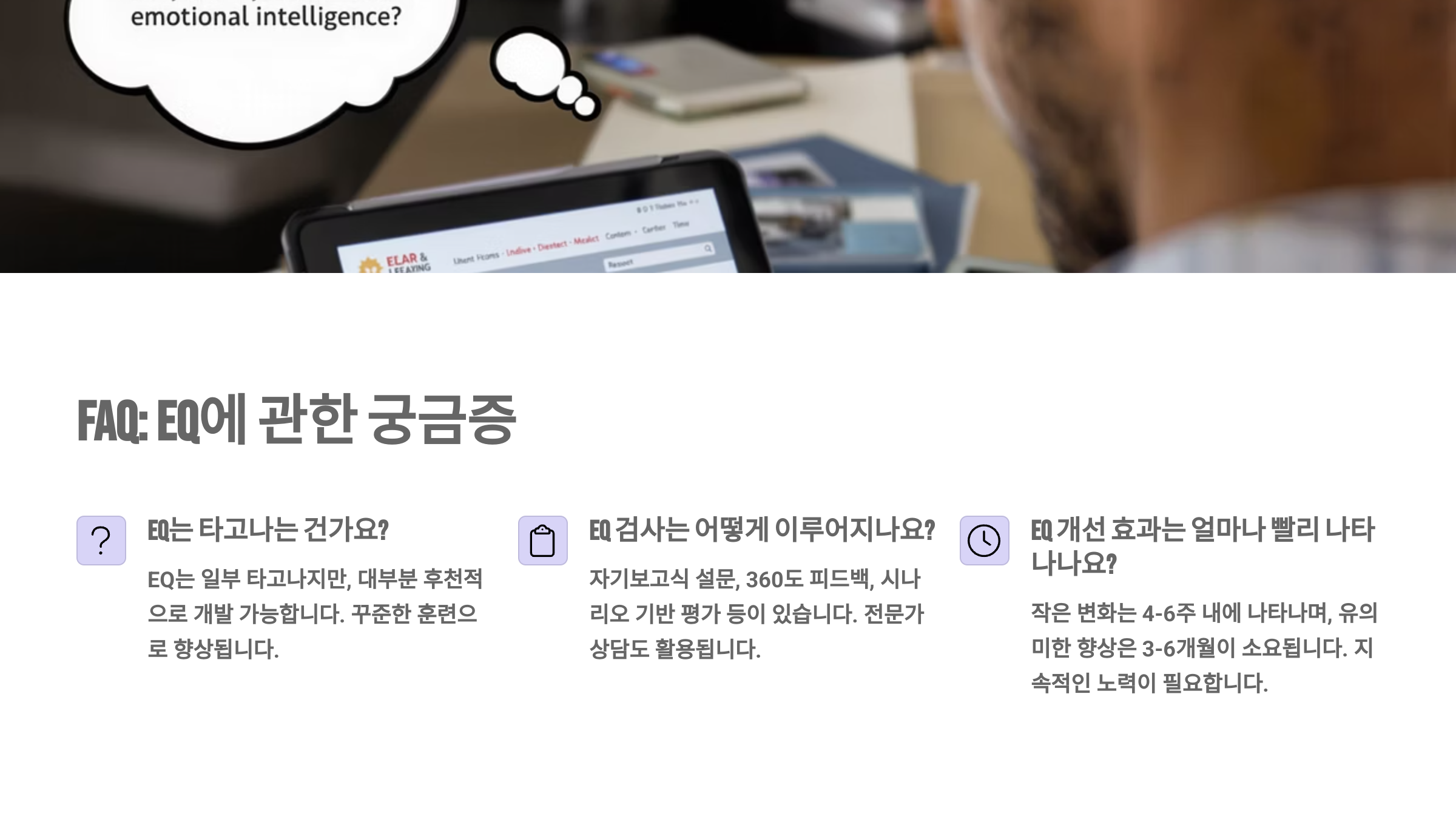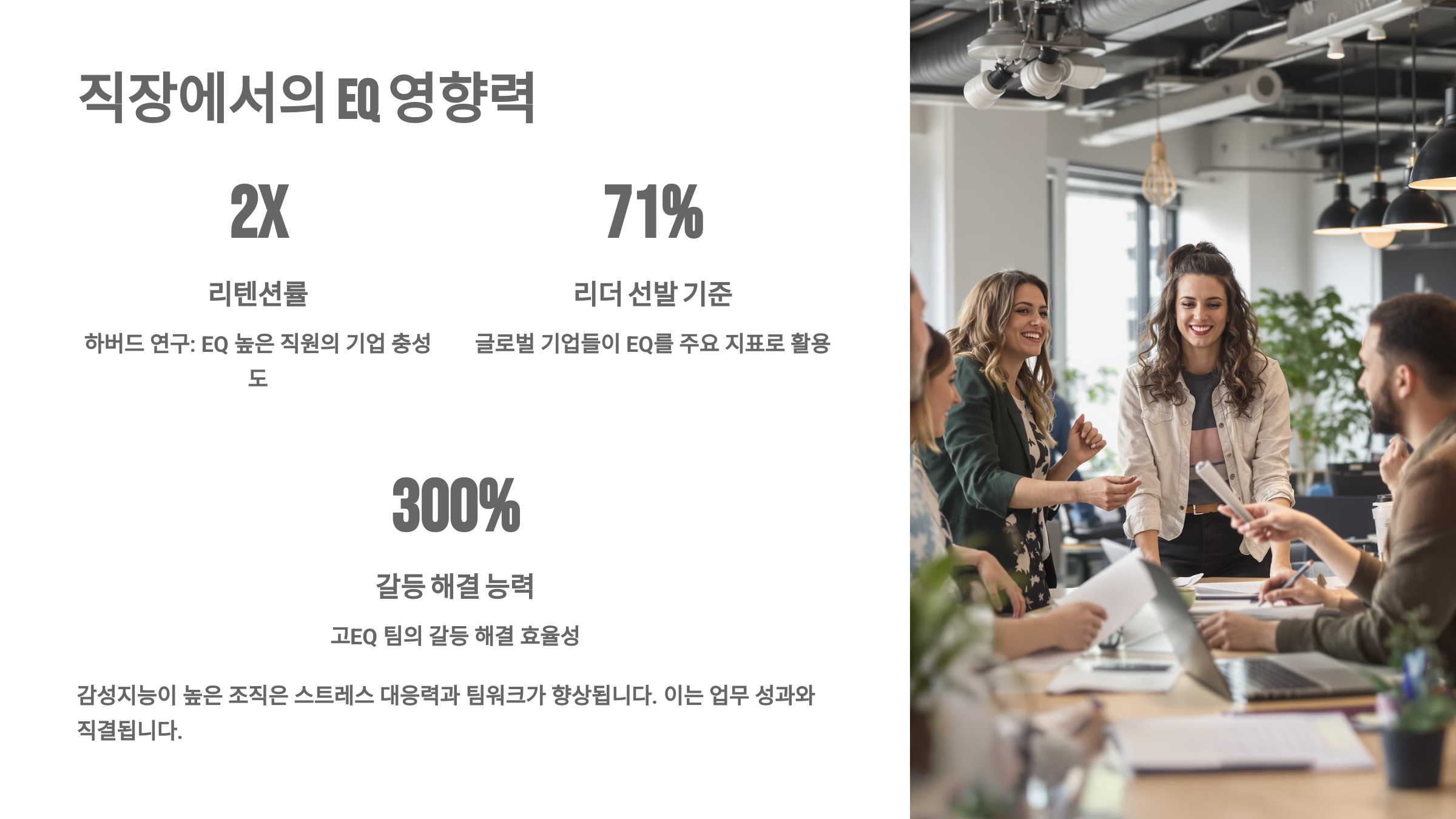 즉, 직장에서의 EQ는 단지 인간적인 매력에서 그치지 않아요. 업무 성과, 리더십, 커뮤니케이션, 고객 서비스 등 거의 모든 업무와 직결되는 핵심 역량이 된다는 거예요.